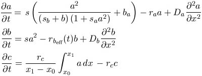 Das Modell baut auf dem Aktivator-Inhibitor-Mechanismus mit Michaelis-Menten-Kinetik auf. Die Zerfallsrate