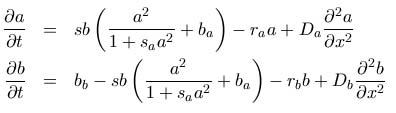 Das verwendete System partieller Differentialgleichungen zur Formulierung der Aktivator-Substrat-Reaktion lautet wie folgt:
