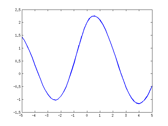 t=-5:0.2:5; plot(t,sin(t)+cos(t)+1./sqrt(1+t.^2))