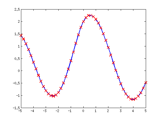 fun = inline('sin(t)+cos(t)+1./sqrt(1+t.^2)') fun(0) hold on plot(t,fun(t),'rx') bfun = inline('sin(n*x)') afun = inline('sin(n*x)','x','n') bfun(1,2) bfun(1,2) - afun(2,1) char(fun) argnames(fun) formula(fun)