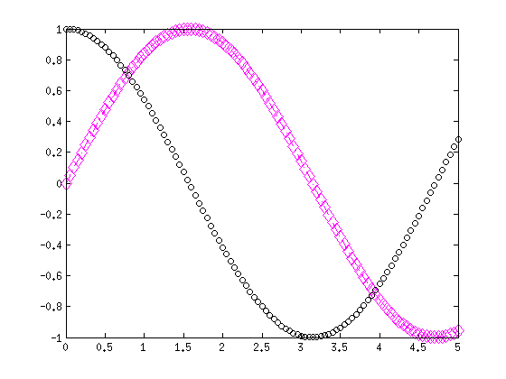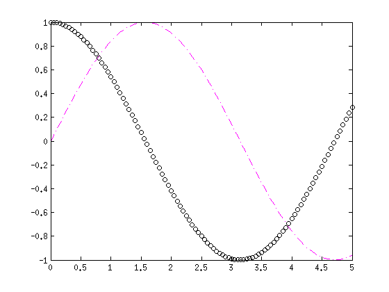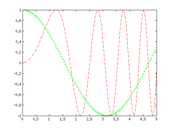plot(x,y,'r--') hold on plot(x,cos(x),'g+') hold off clc help plot